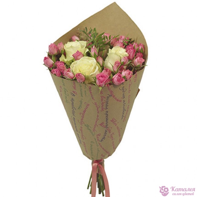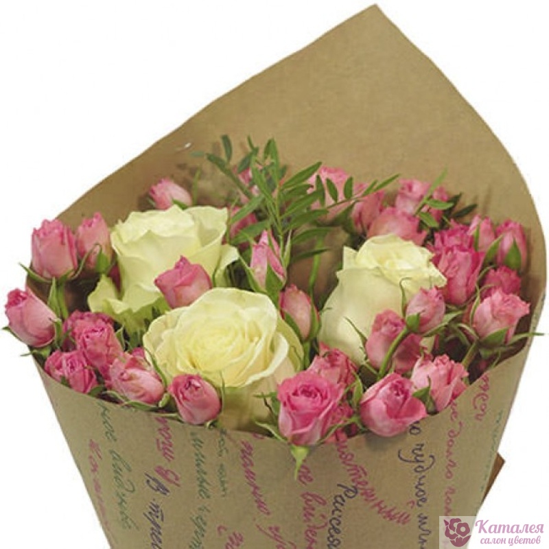 Букет состоит из 3 белые розы, 4 ветки кустовой розовой розы, крафт, розовая лента.
