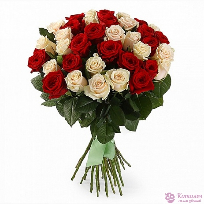 Букет состоит из 51 красная и белая роза, прозрачная упаковка, красная и белая лента.