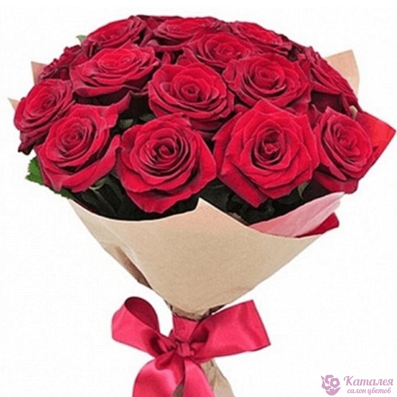 Букет состоит из 15 красных роз, крафт, атласная лента.