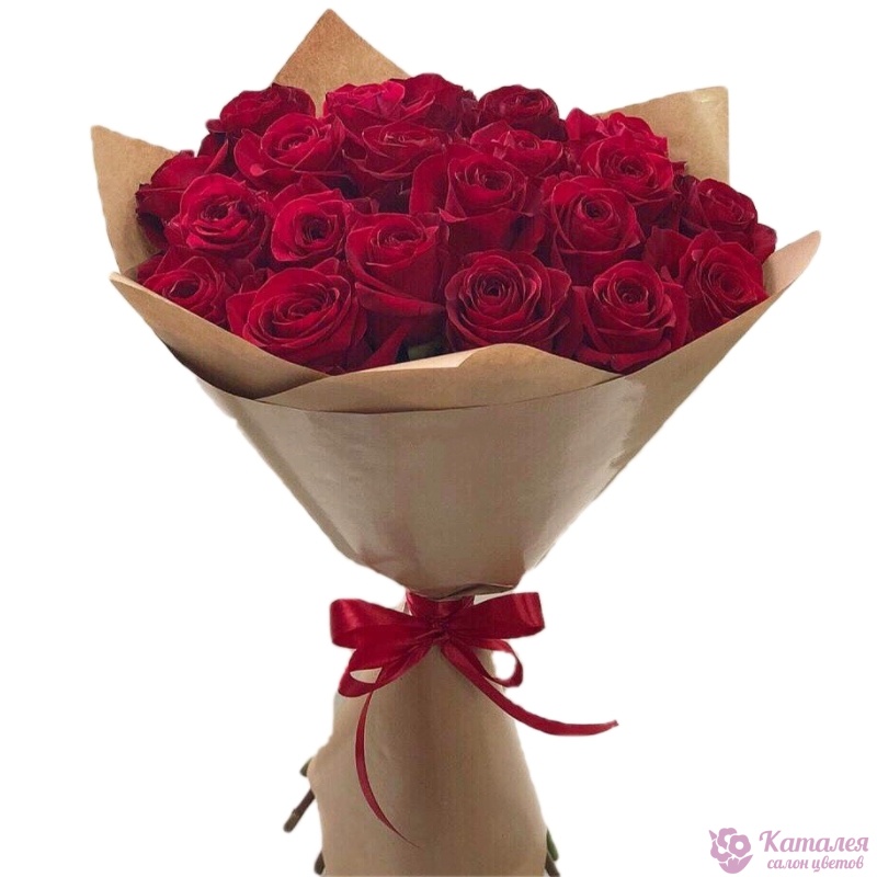 Букет состоит из 21 бордовая роза, крафт, атласная лента.
