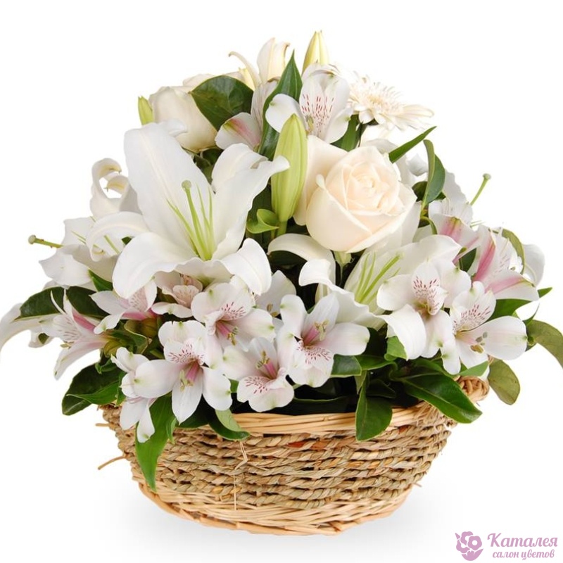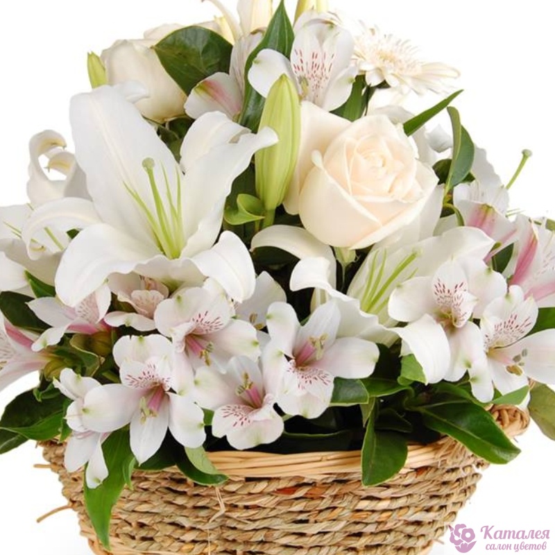 3 розы, 1 ветка белой лилии, 7 альстромерий, зелень, корзина, оазис.