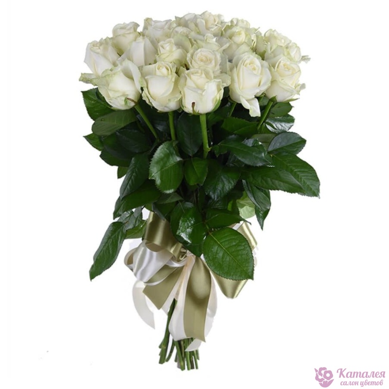 Букет состоит из 19 белых роз, прозрачная упаковка, атласная лента.