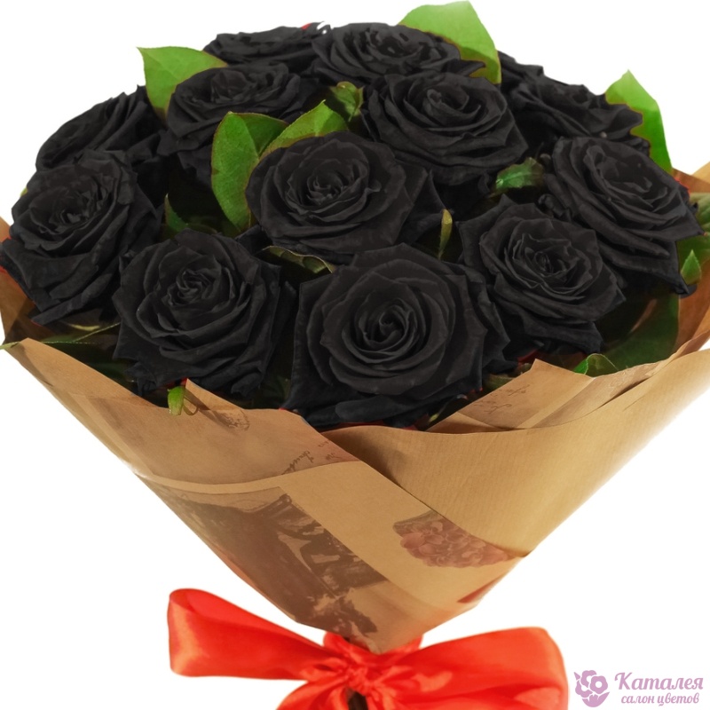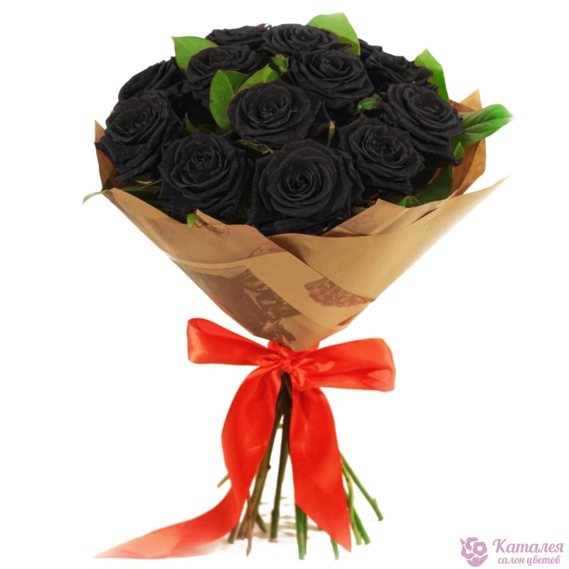 Букет состоит из 13 черных роз, зелень, крафт, атласная лента.