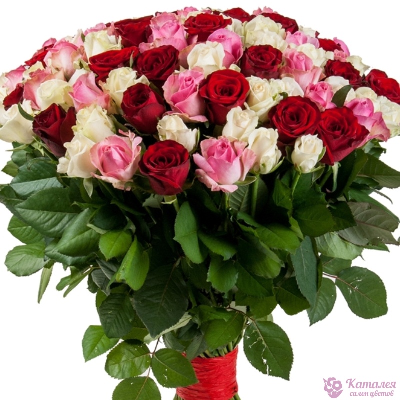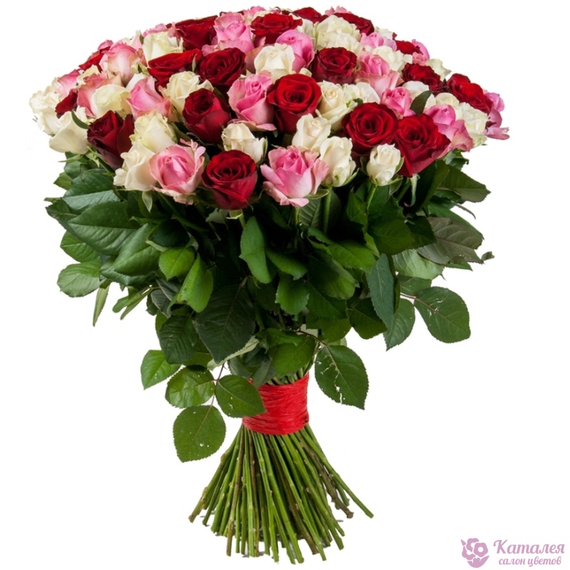 Букет состоит из 17 белых роз, 17 красных роз, 17 розовых роз, прозрачная упаковка, атласная лента.