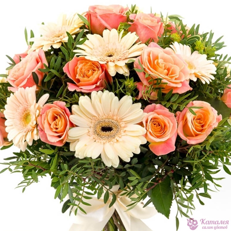 Букет состоит из 15 коралловых роз, 9 гербер, декоративная зелень, прозрачная упаковка, атласная лента.