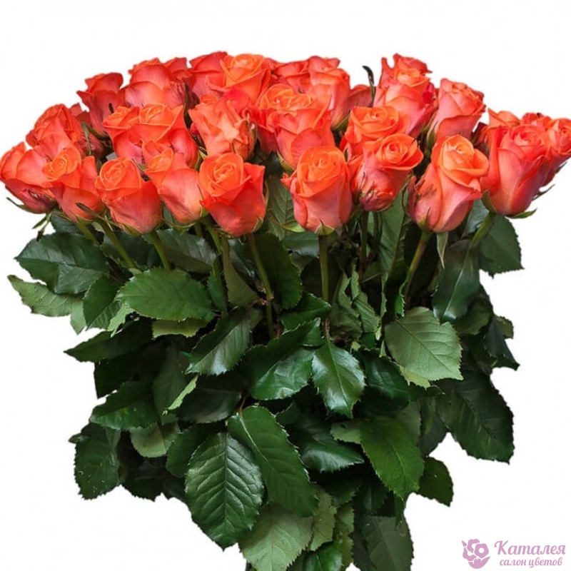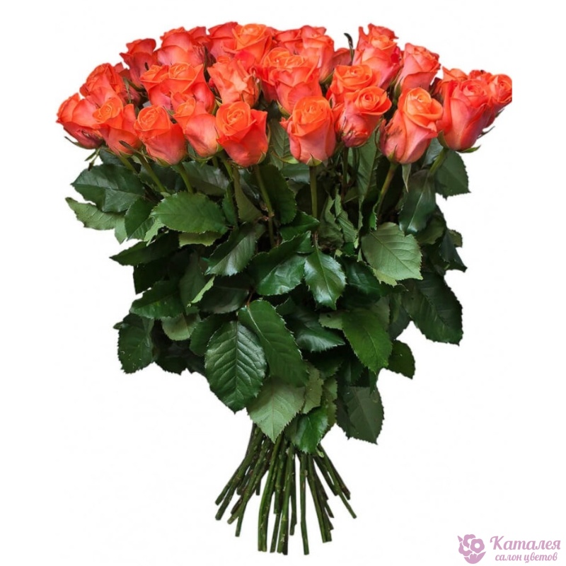 Букет состоит из 51 коралловая роза, прозрачная упаковка, атласная лента.