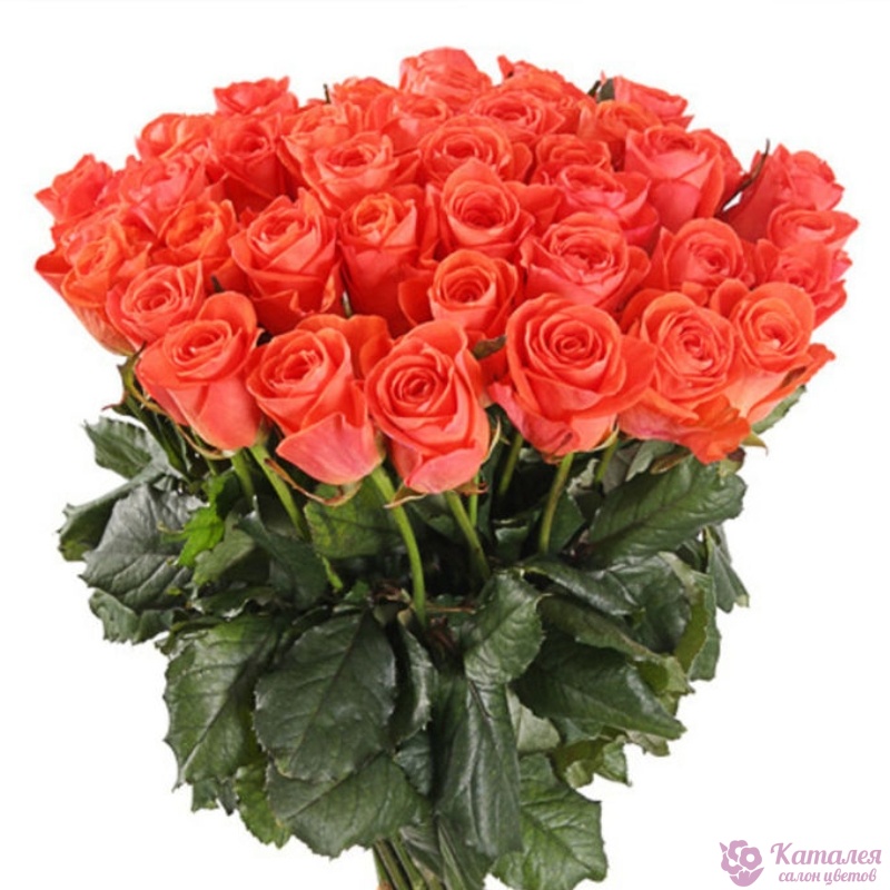 Букет состоит из 55 коралловых роз, прозрачная упаковка, атласная лента.