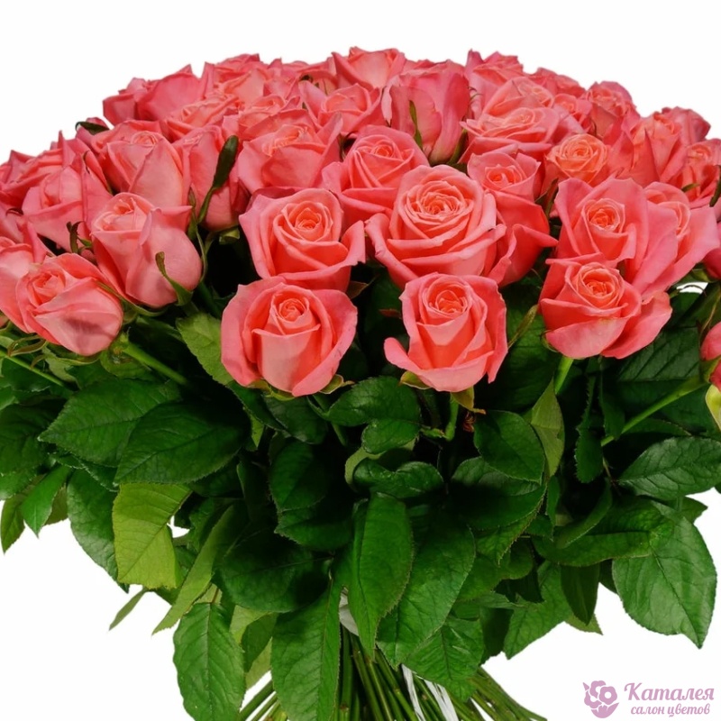 Букет состоит из 55 коралловых роз, прозрачная упаковка, атласная лента.