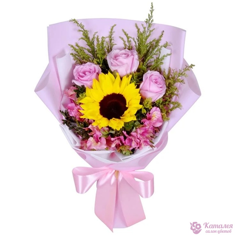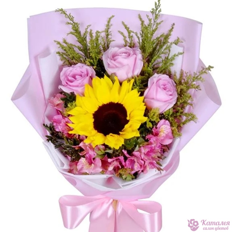 Букет состоит из 1 подсолнух, 3 розовые розы, 3 ветки альстромерии, декоративная зелень, красивая упаковка, атласная лента.