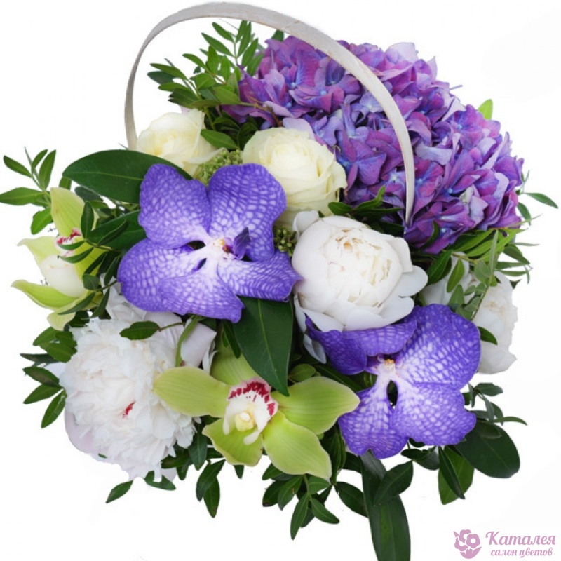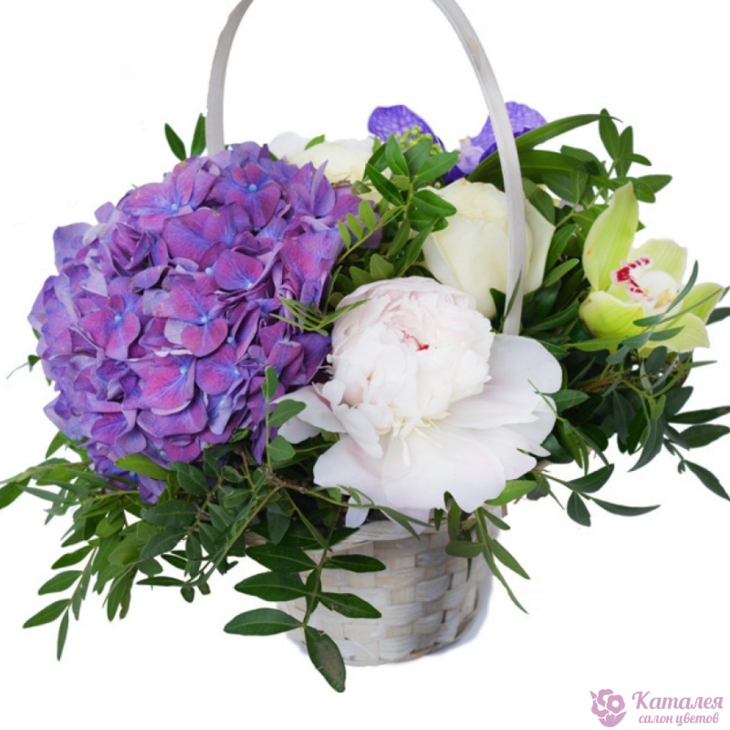 Букет состоит из 3 пиона, 2 розы, 4 орхидеи, 1 гортензия, зелень, корзина, оазис.