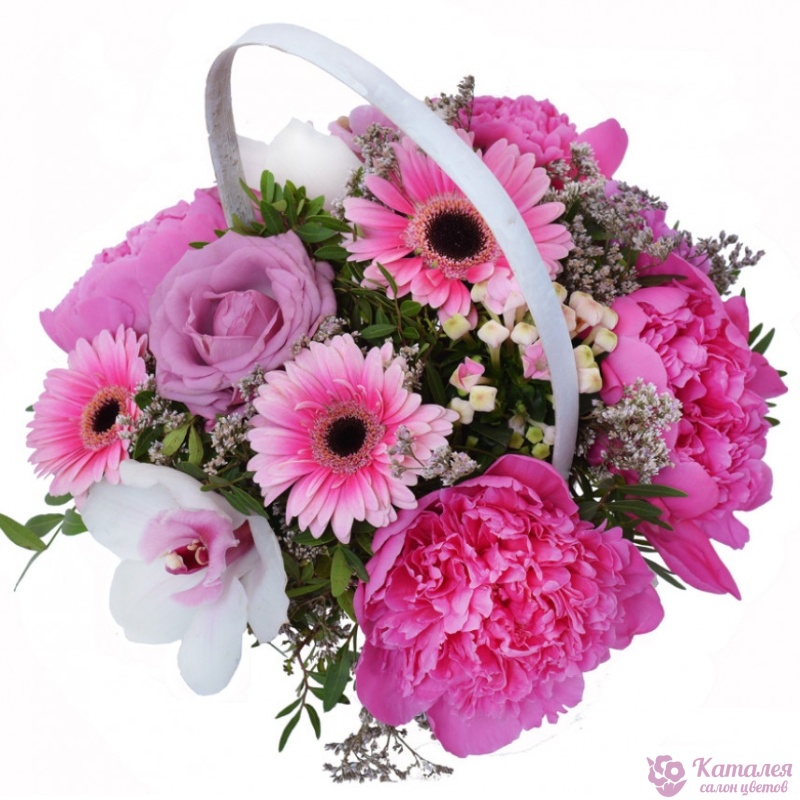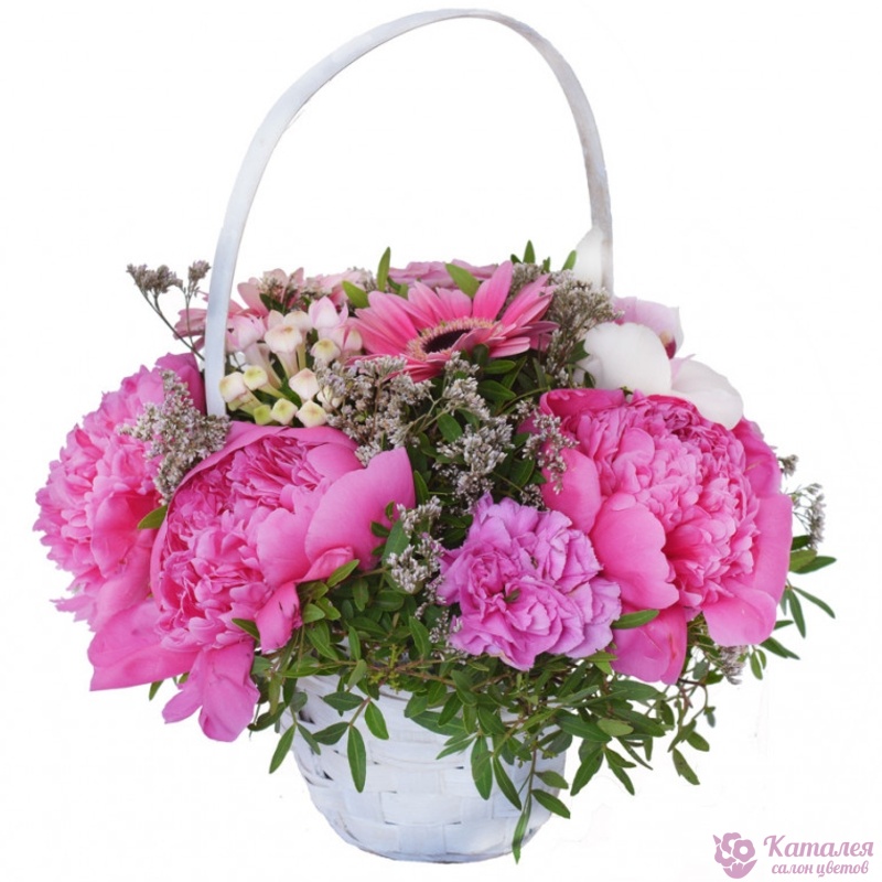 Букет состоит из 5 пионов, 2 розы, 2 гербера, 2 орхидеи, 1 бувардия, 3 лимониум, зелень, корзина, оазис.
