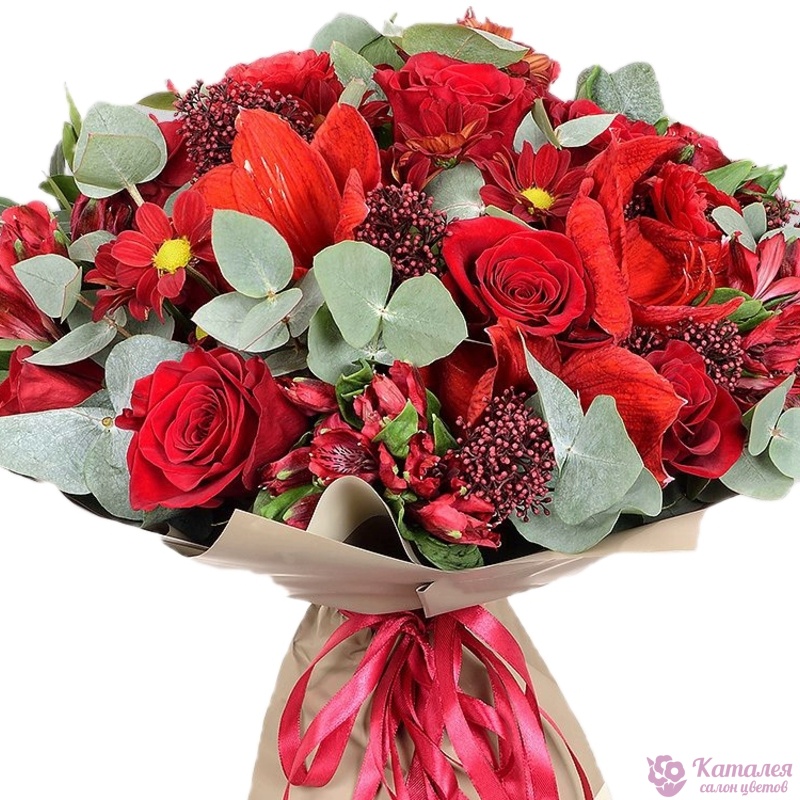 Букет состоит из 9 роз, 3 ранункулюса, 3 кустовых хризантемы, 1 амариллис, 7 веток альстромерии, 5 скиммия, зелень, крафт, атласная лента.