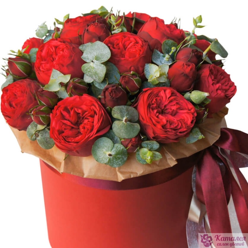 Букет состоит из 15 кустовых пионовидных роз, эвкалипт, коробка, оазис, лента.