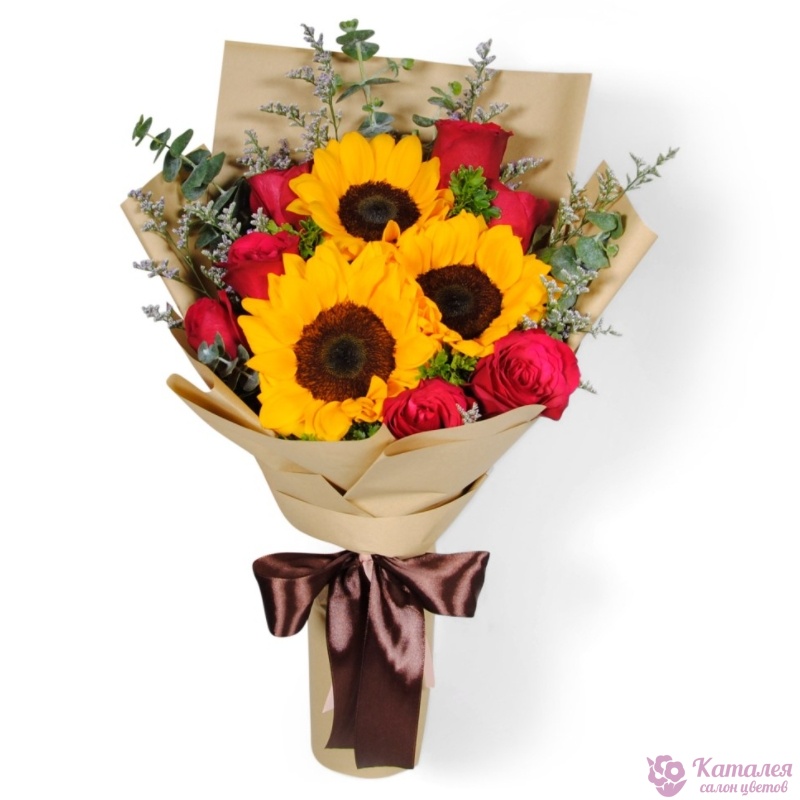 Букет состоит из 10 красных роз, 3 подсолнуха, декоративная зелень, крафт, атласная лента.
