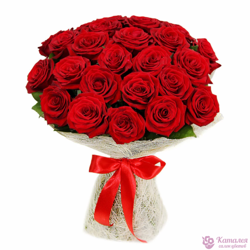 Букет состоит из 25 красных роз, красивая упаковка, атласная лента.
