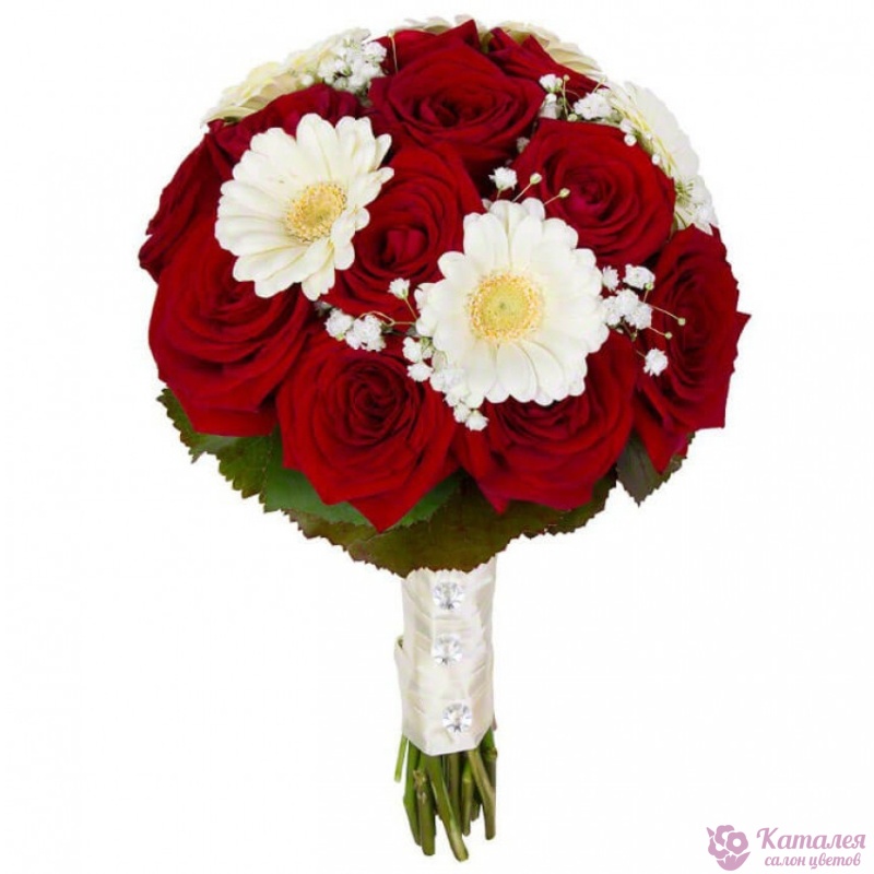 Букет состоит из 12 красных роз, 5 гербер, 1 гипсофила, зелень, атласная лента.