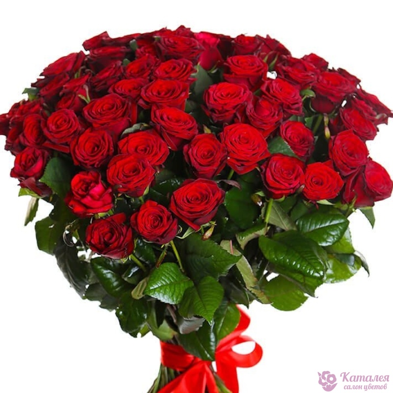 Букет состоит из 55 красных роз, прозрачная упаковка, атласная лента.