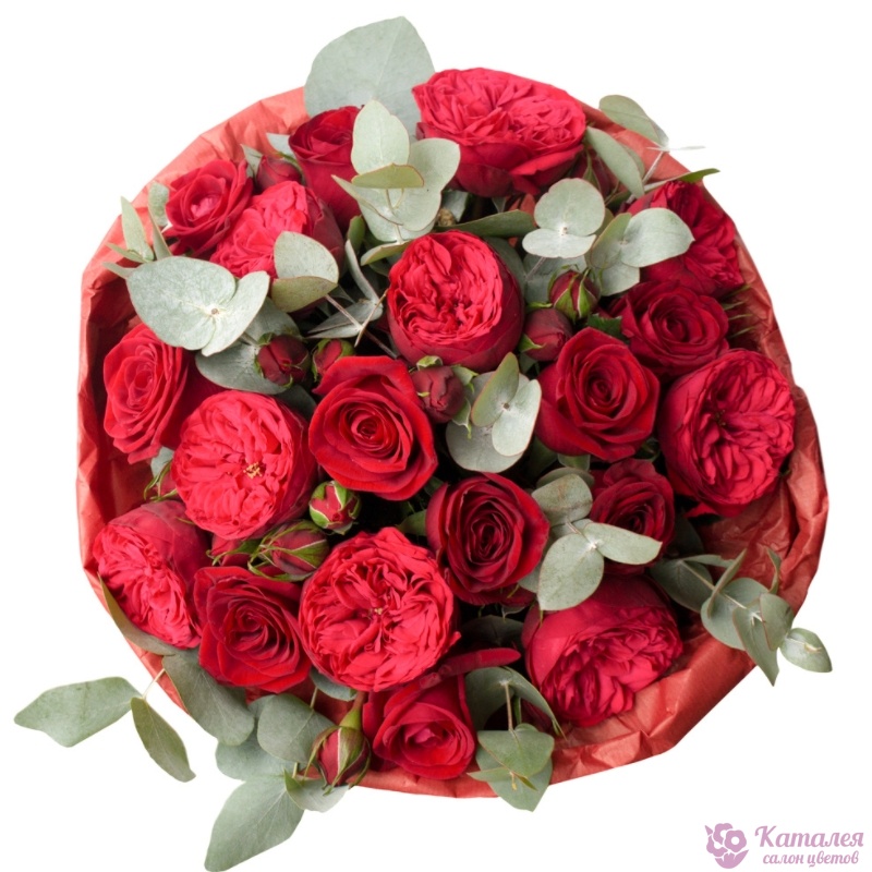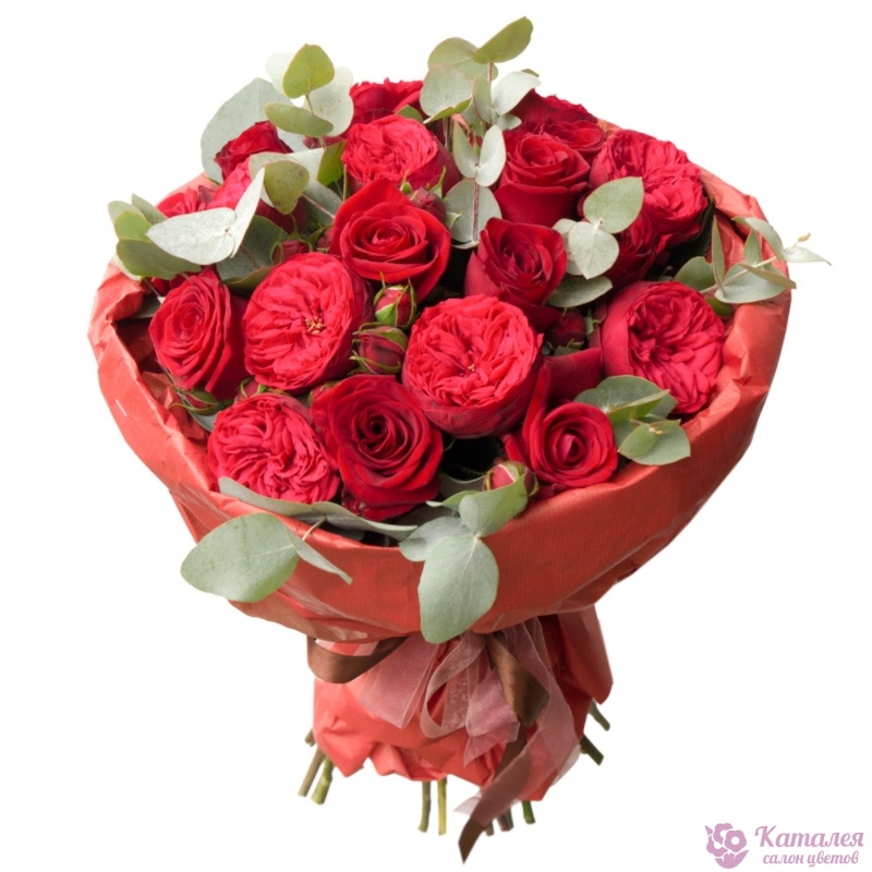 Букет состоит из 15 красных роз, 5 веток кустовых роз Red Piano, эвкалипт, крафт, атласная лента.