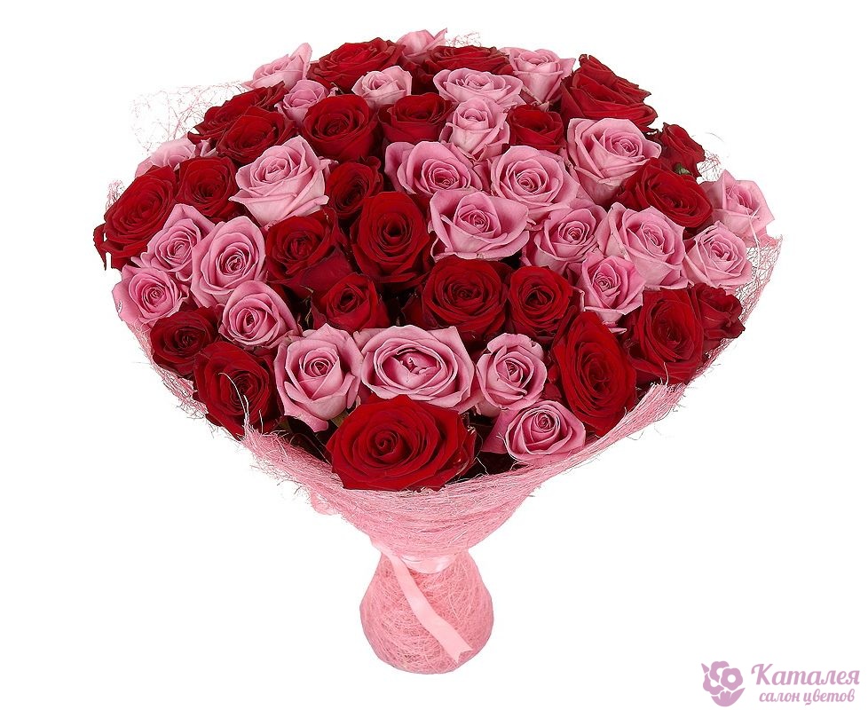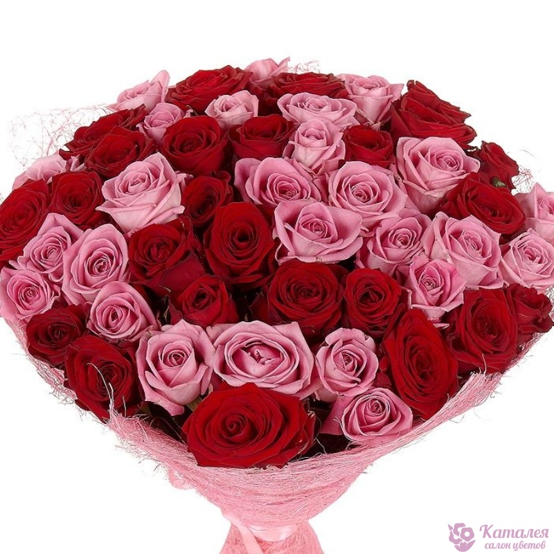 Букет состоит из 23 красной розы, 22 розовой розы, розовая упаковка, розовая или красная лента.