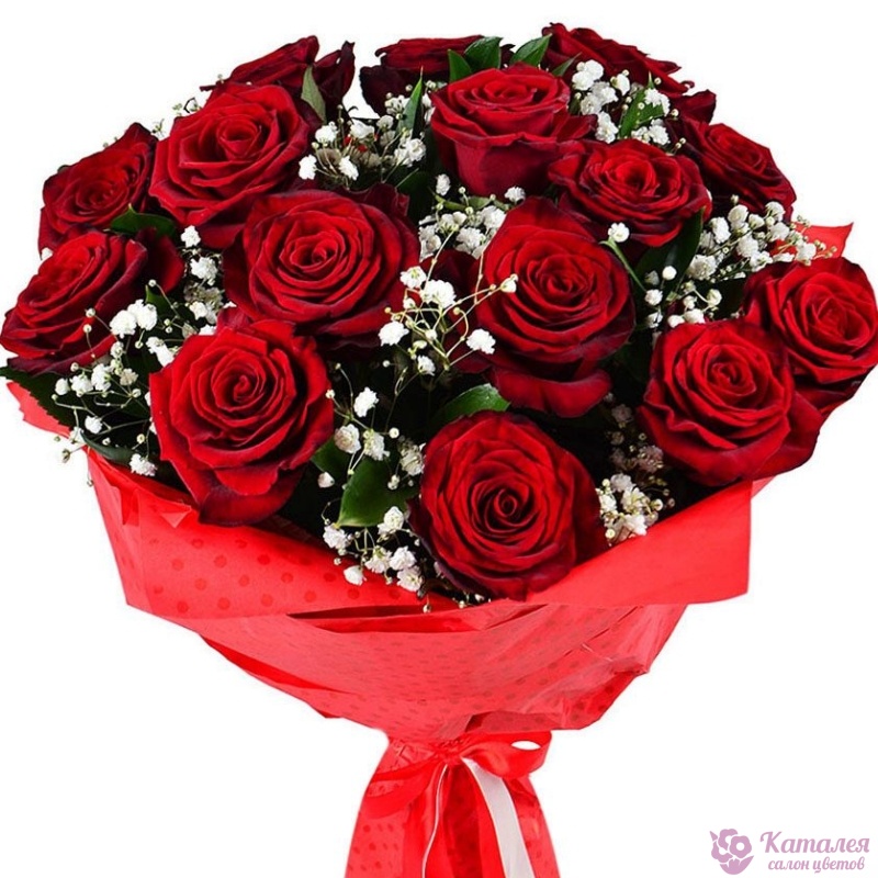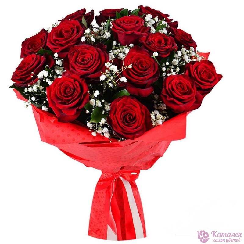 Букет состоит из 15 красных роз, 3 ветки гипсофилы, красивая упаковка, атласная лента.