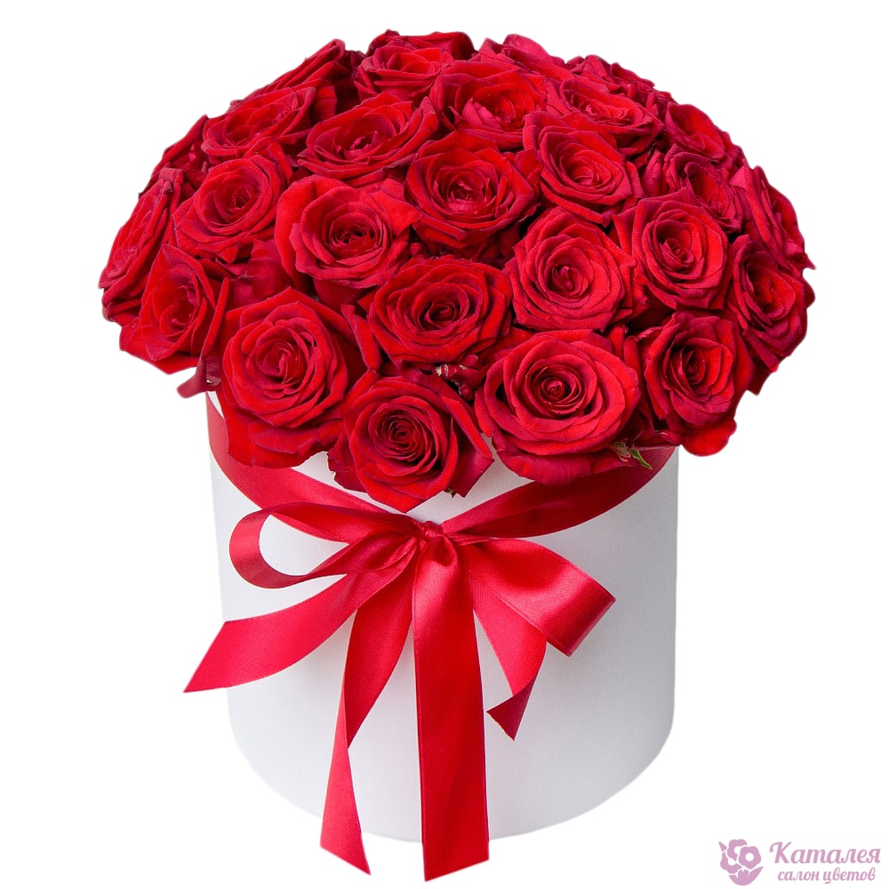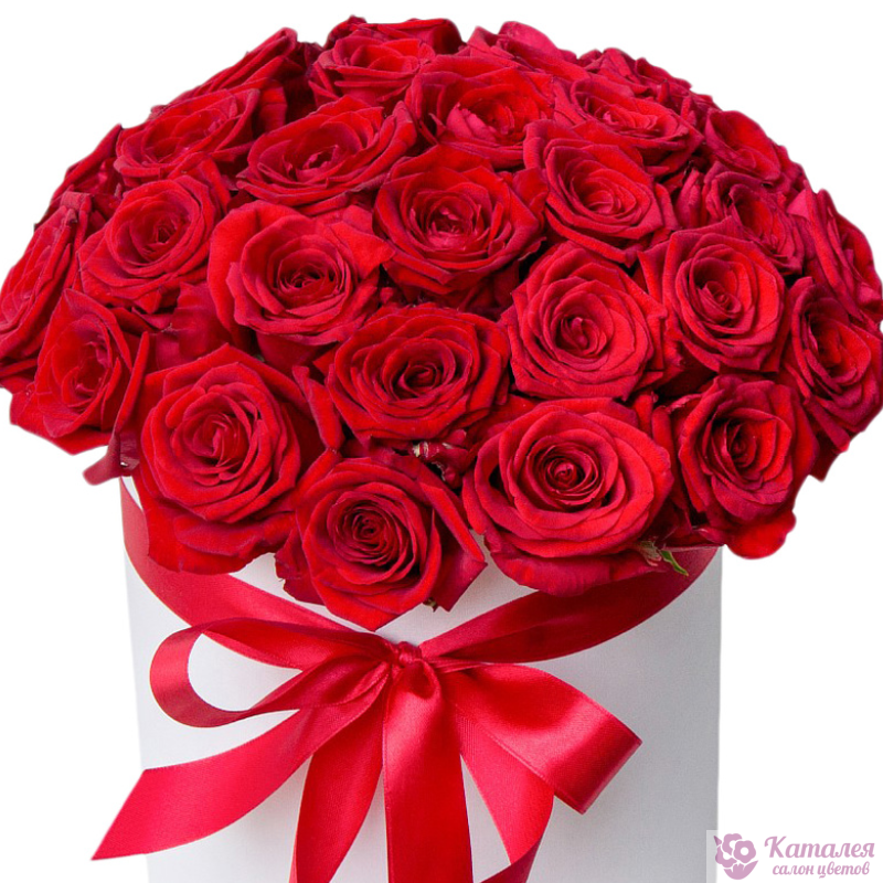 35 красных роз, белая коробка, красная лента.