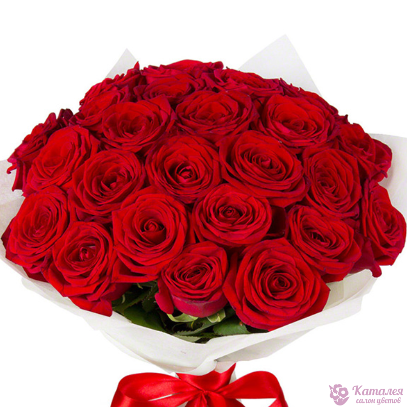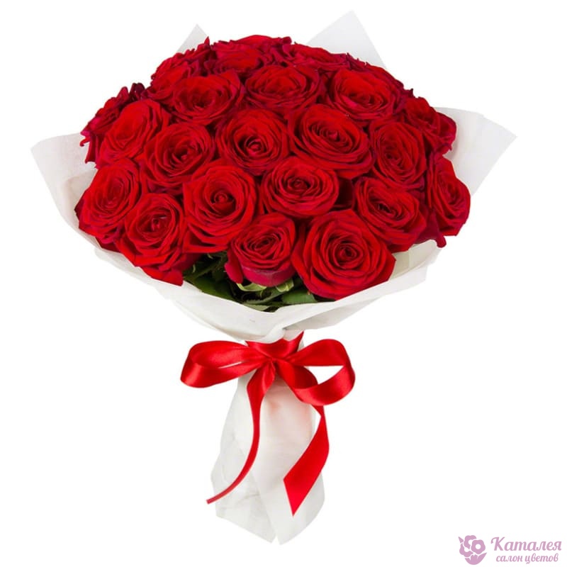 Букет состоит из 25 красных роз, красивая упаковка, атласная лента.