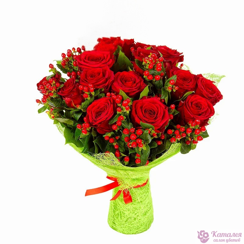 Букет состоит из 15 красных роз, 11 гиперикум, сизаль, атласная лента.