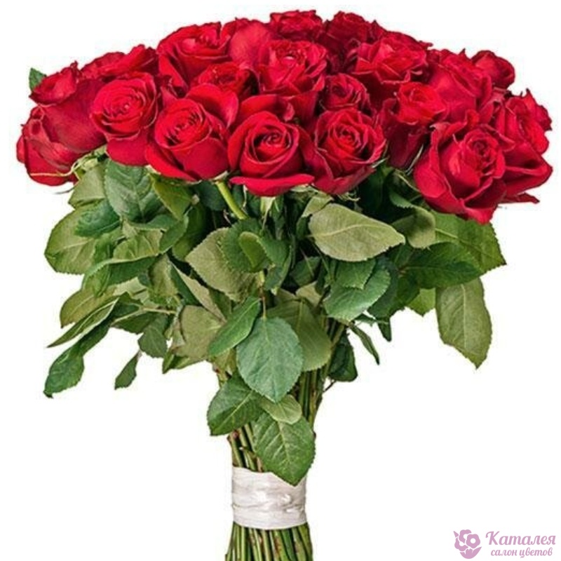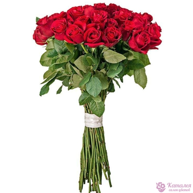 Букет состоит из 31 красная роза, прозрачная упаковка, красная лента.