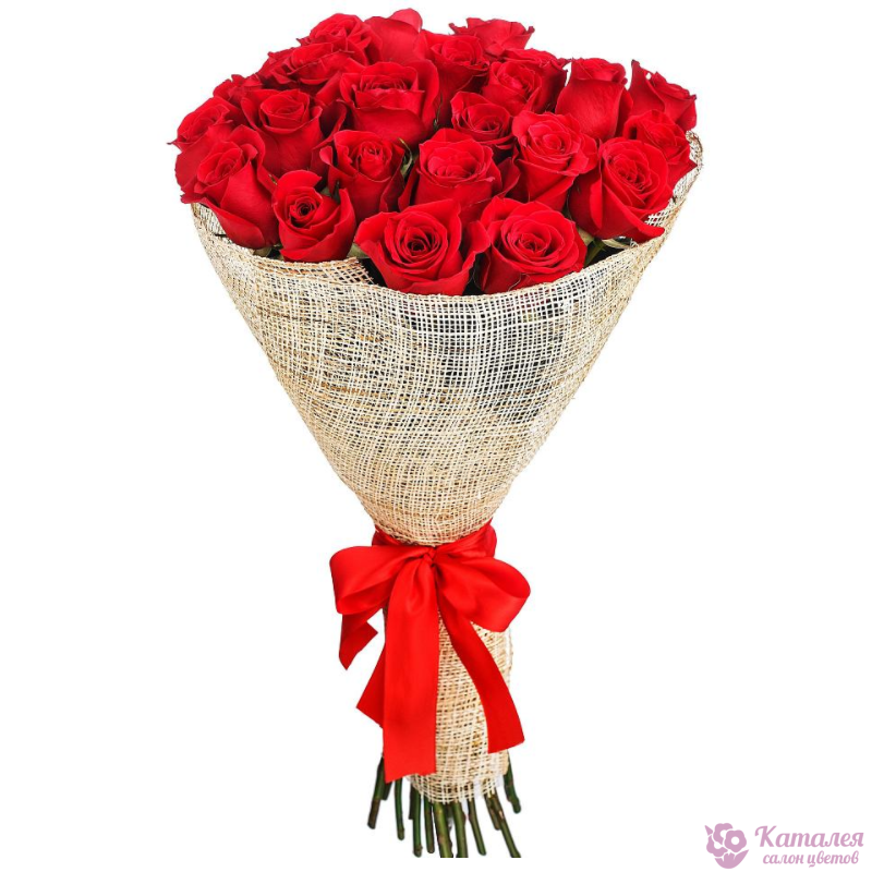Букет состоит из 25 красных роз, сетка, атласная лента.