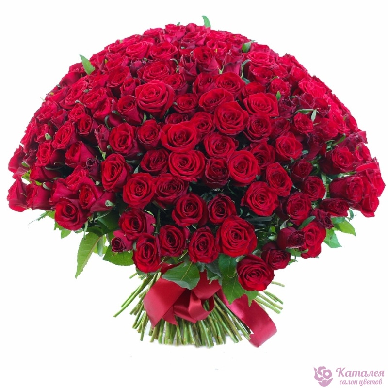 Букет состоит из 201 красная роза, зелень, прозрачная упаковка, атласная лента.