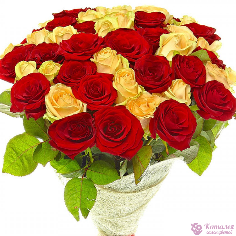 Букет состоит из 26 красных роз, 25 желтых роз, зелень, красивая упаковка.