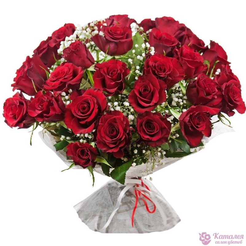 Букет состоит из 31 красная роза, 7 гипсофила, красивая упаковка, атласная лента.