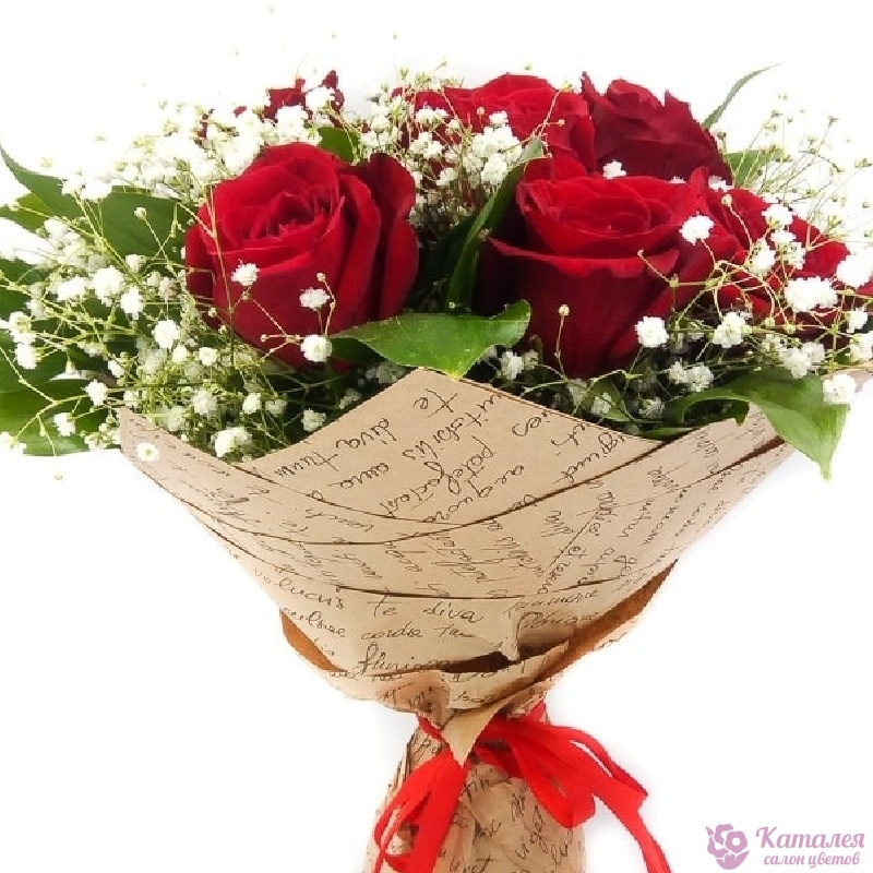 Букет состоит из 9 красных роз, 2 ветки гипсофилы, крафт, атласная лента.
