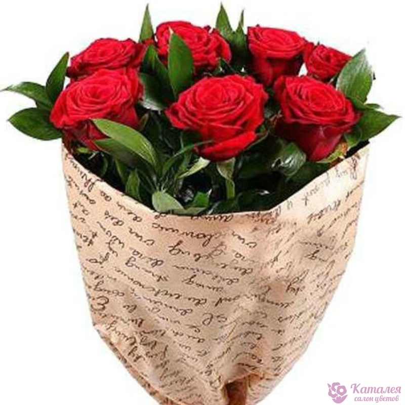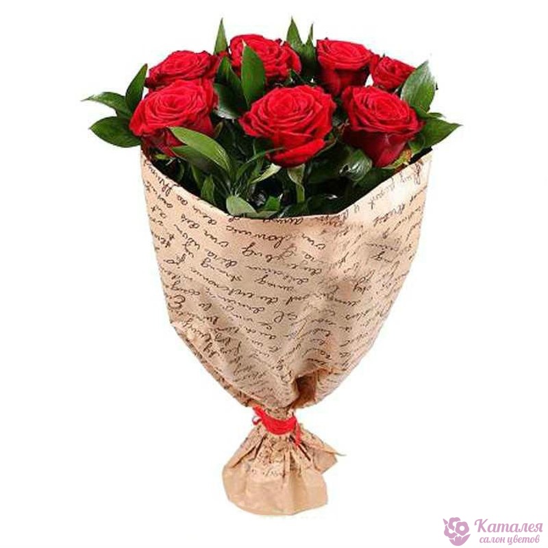 Букет состоит из 7 красных роз, зелень, крафт, красная лента.