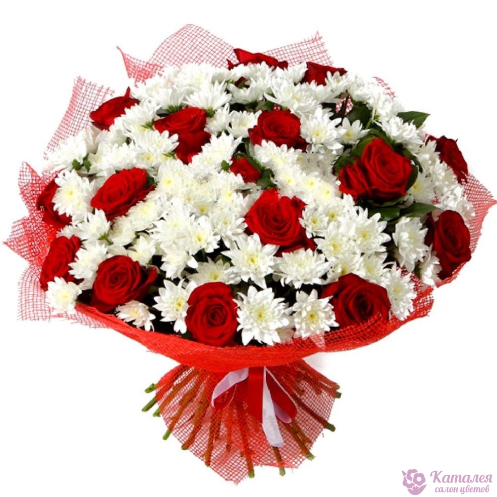 Букет состоит из 17 красных роз, 15 веток белой хризантемы, красивая упаковка.