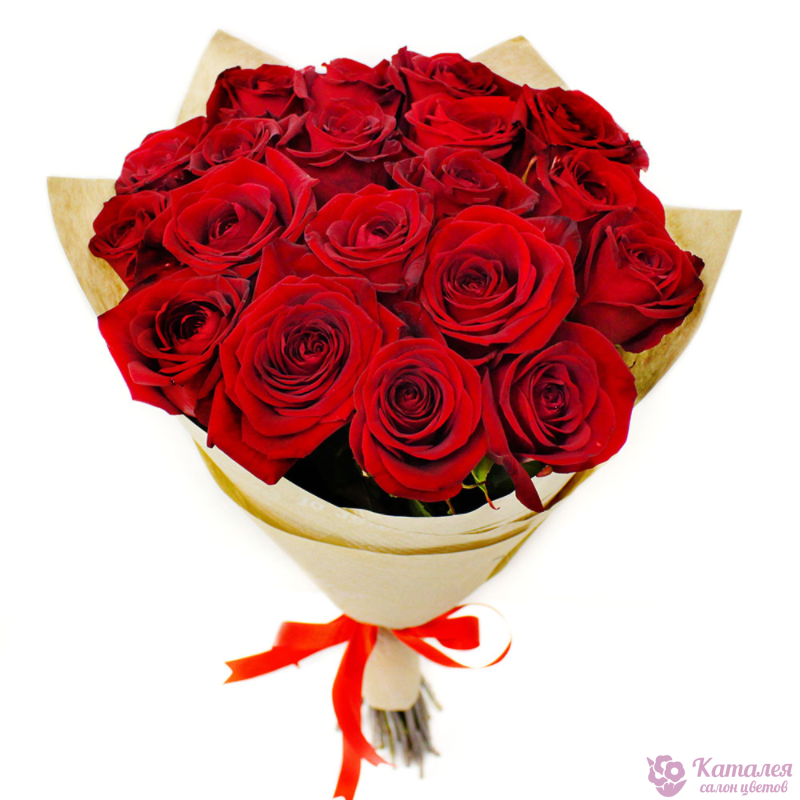 Букет состоит из 21 красная роза, крафт, атласная лента.