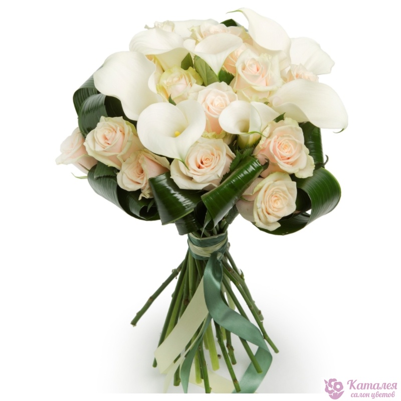 Букет состоит из 16 кремовых роз, 9 белых калл, аспидистра, прозрачная упаковка, атласная лента.