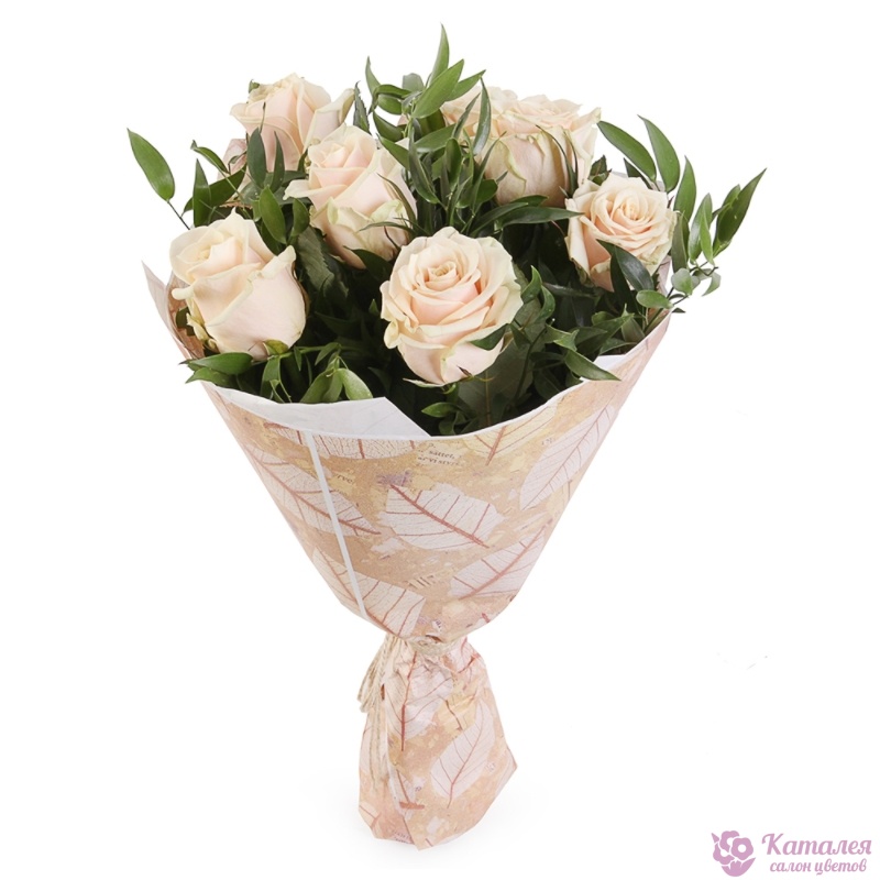 Букет состоит из 9 кремовых роз, зелень, крафт, бежевая лента.