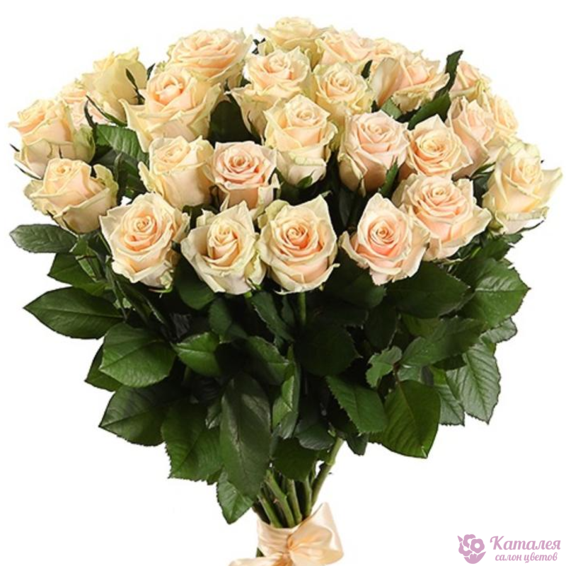 Букет состоит из 25 кремовых роз, прозрачная упаковка, атласная лента.