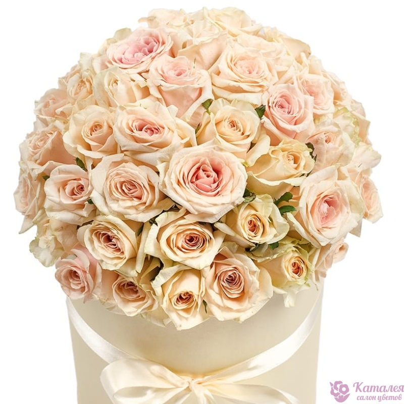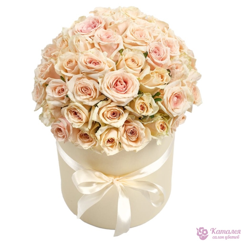 Букет состоит из 51 кремовая роза, коробка, атласная лента.