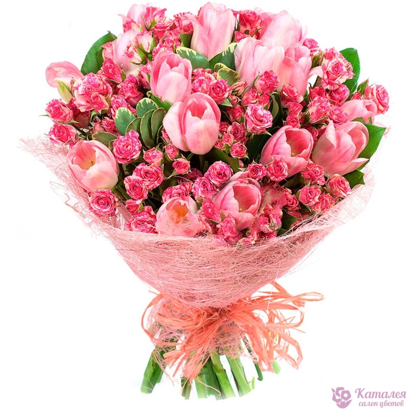 Букет состоит из 15 розовых тюльпанов, 8 розовых кустовых роз, зелень, красивая упаковка, атласная лента.
