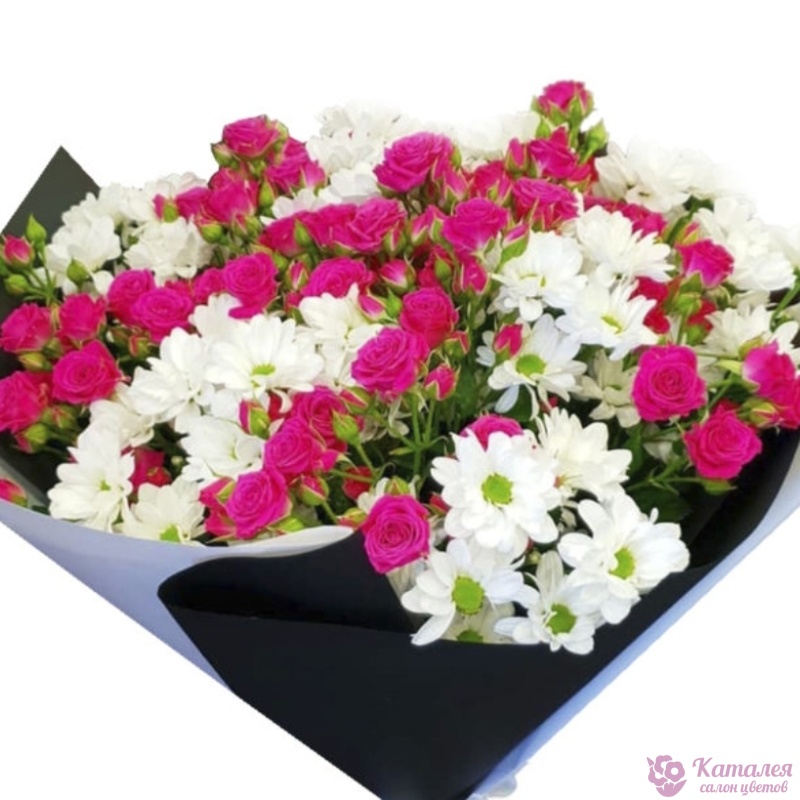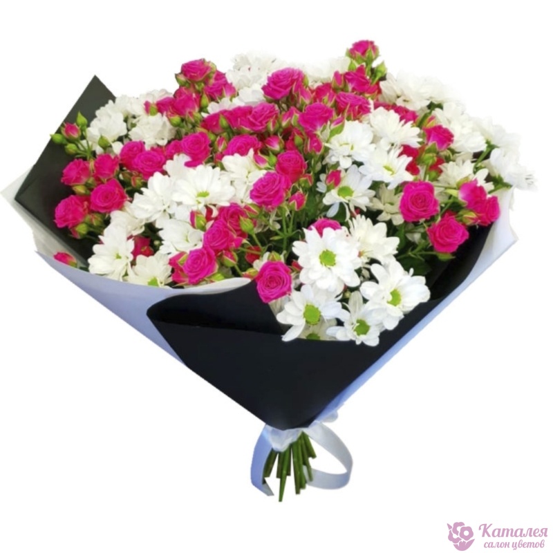 Букет состоит из 11 кустовых роз, 6 веток хризантем, красивая упаковка, атласная лента.