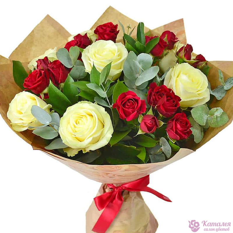 Букет состоит из 7 белых роз, 4 ветки красных кустовых роз, эвкалипт, крафт, атласная лента.