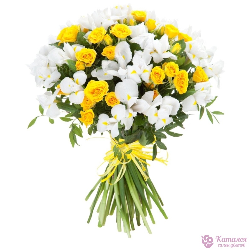 Букет состоит из 35 белых ирисов, 10 желтых кустовых роз, прозрачная упаковка, атласная лента.