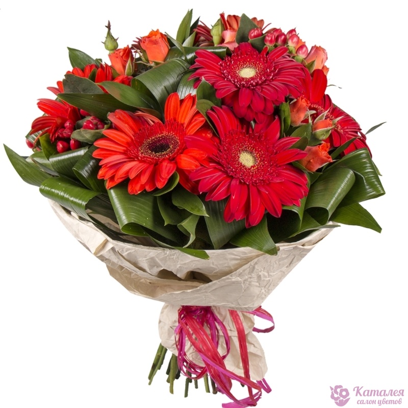 Букет состоит из 7 гербер, 4 ветки кустовых роз, 2 гиперикума, аспидистра, крафт, лента.