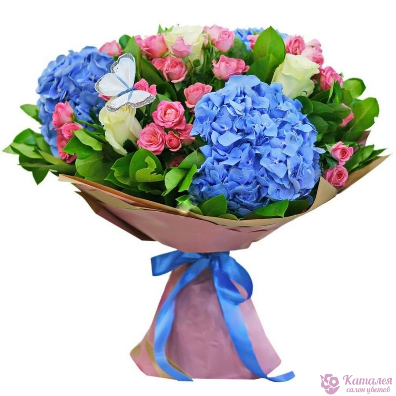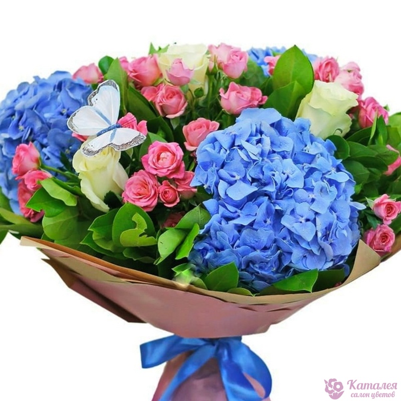 Букет состоит из 3 гортензии, 3 розы, 7 веток кустовых роз, зелень, крафт, атласная лента.