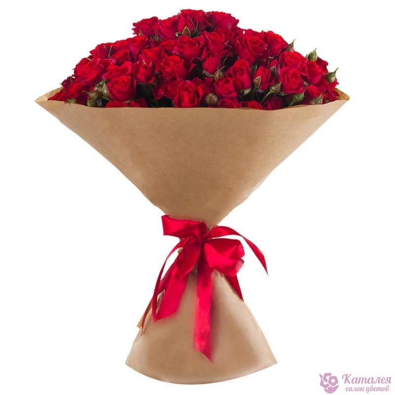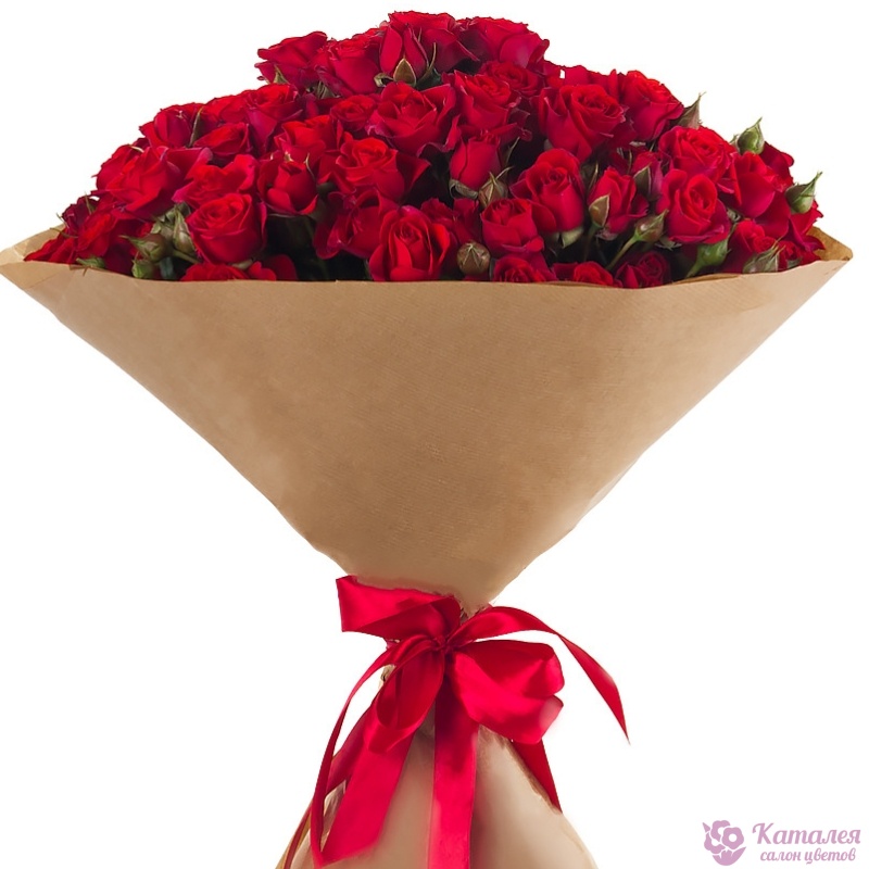 Букет состоит из 25 красных кустовых роз, крафт, атласная лента.