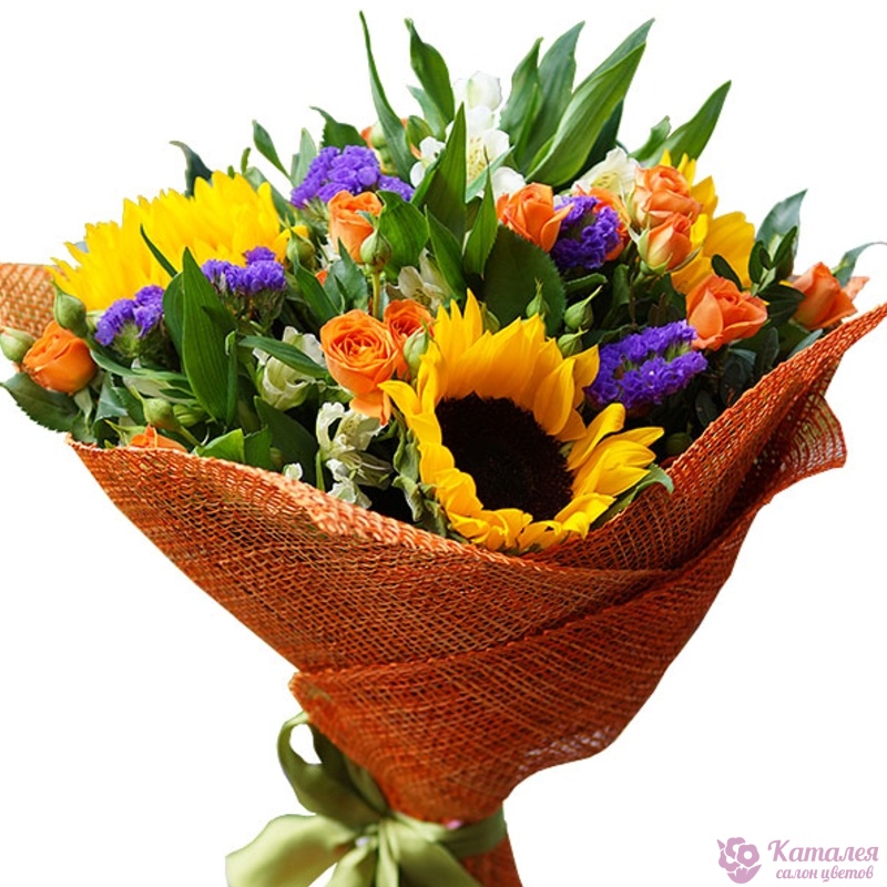 Букет состоит из 5 кустовых роз, 3 подсолнуха, 6 веток альстромерии, 5 веток статицы, зелень, красивая упаковка, атласная лента.
