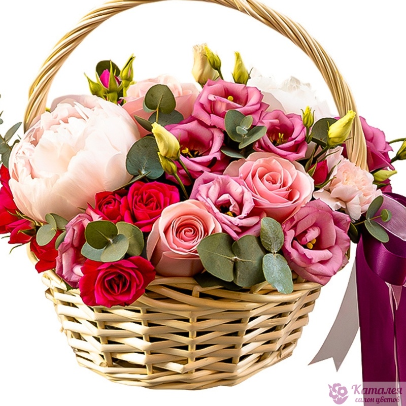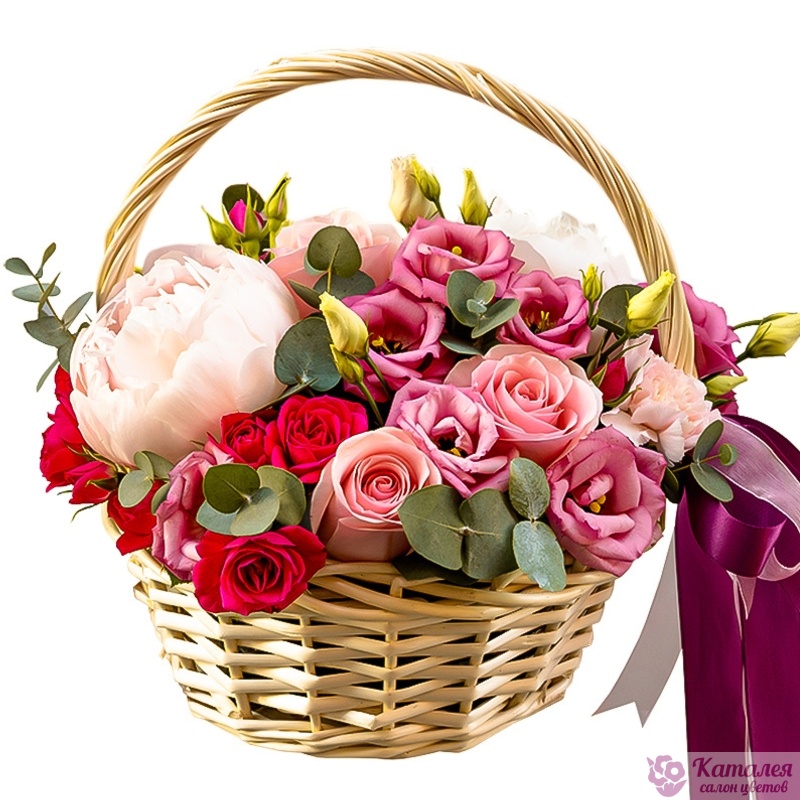 Букет состоит из 2 пиона, 3 розы, 2 ветки кустовой розы, 2 ветки эустомы, 2 гвоздики, зелень, корзина, оазис.