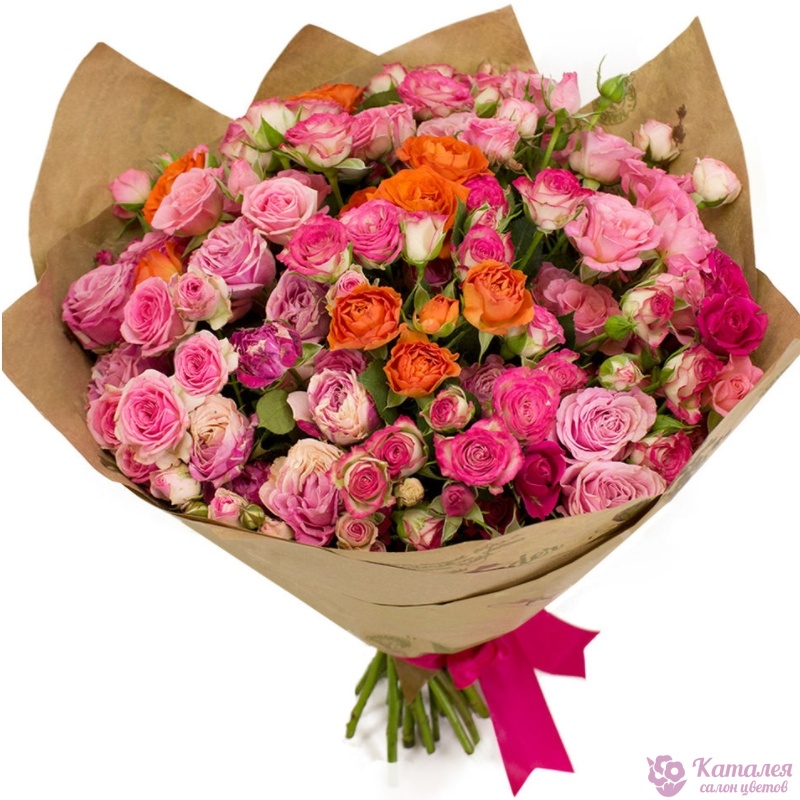 Букет состоит из MIX из 19 кустовых роз, крафт, атласная лента.